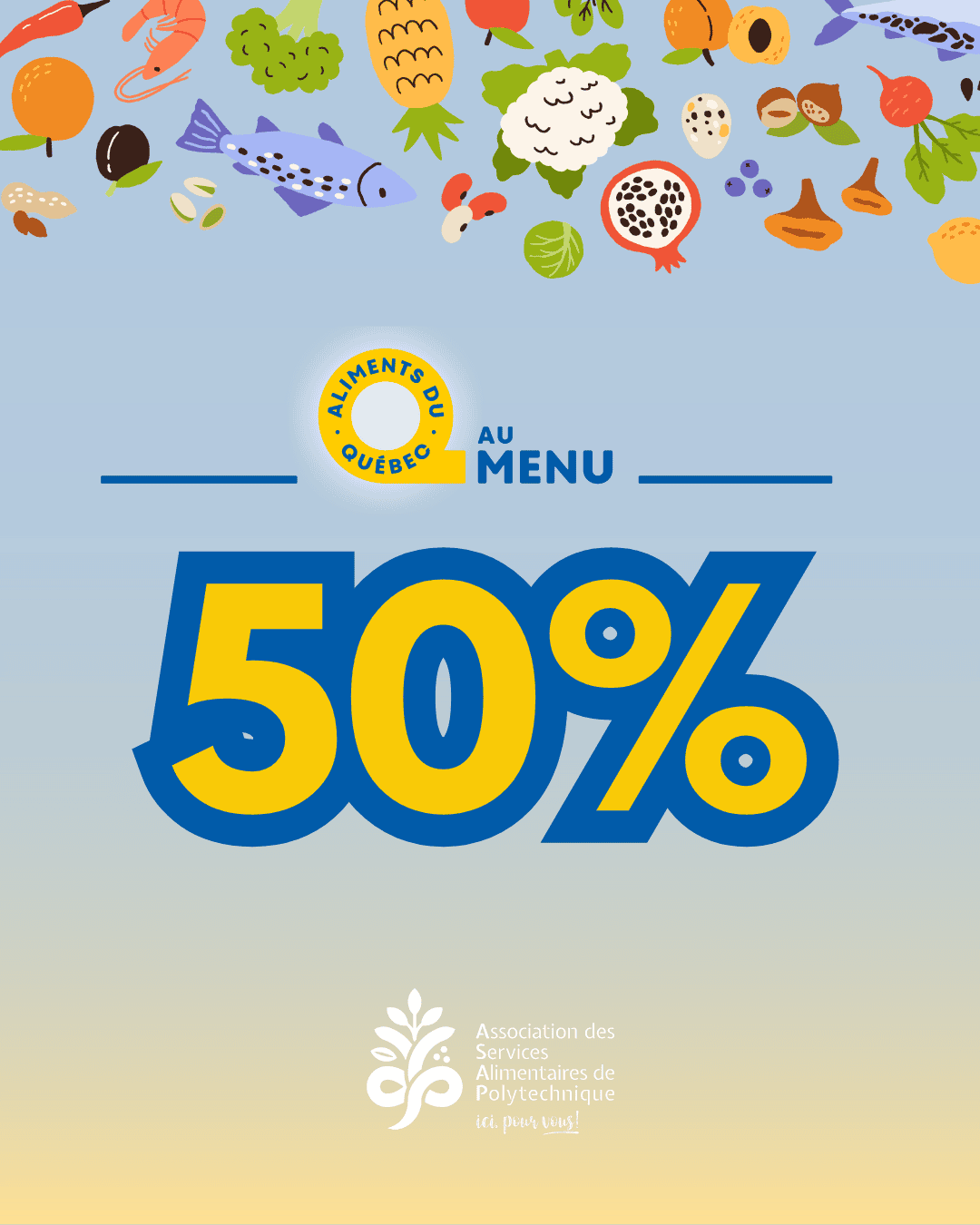 Nous sommes heureux d’annoncer que nous avons atteint un taux de 50 % d’achats en Aliments du Québec pour la période 2024-2025 ! Cela signifie que la moitié de nos achats provient de produits cultivés, préparés ou transformés ici, au Québec.